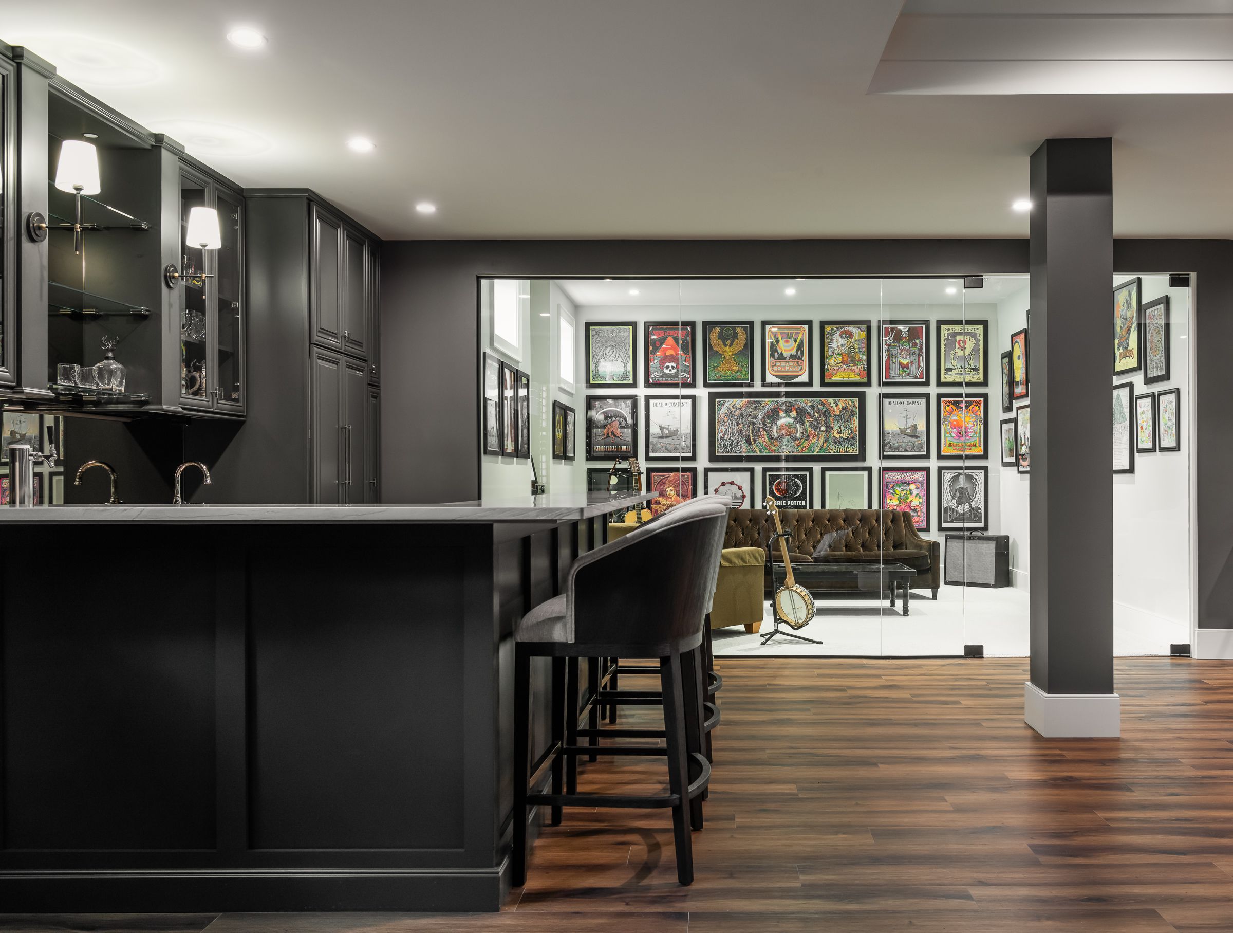 This stunning lower-level retreat by Vanderbilt Homes blends a sophisticated entertainer’s bar with a gallery-style music lounge—designed for relaxing, hosting, and showcasing what you love most.